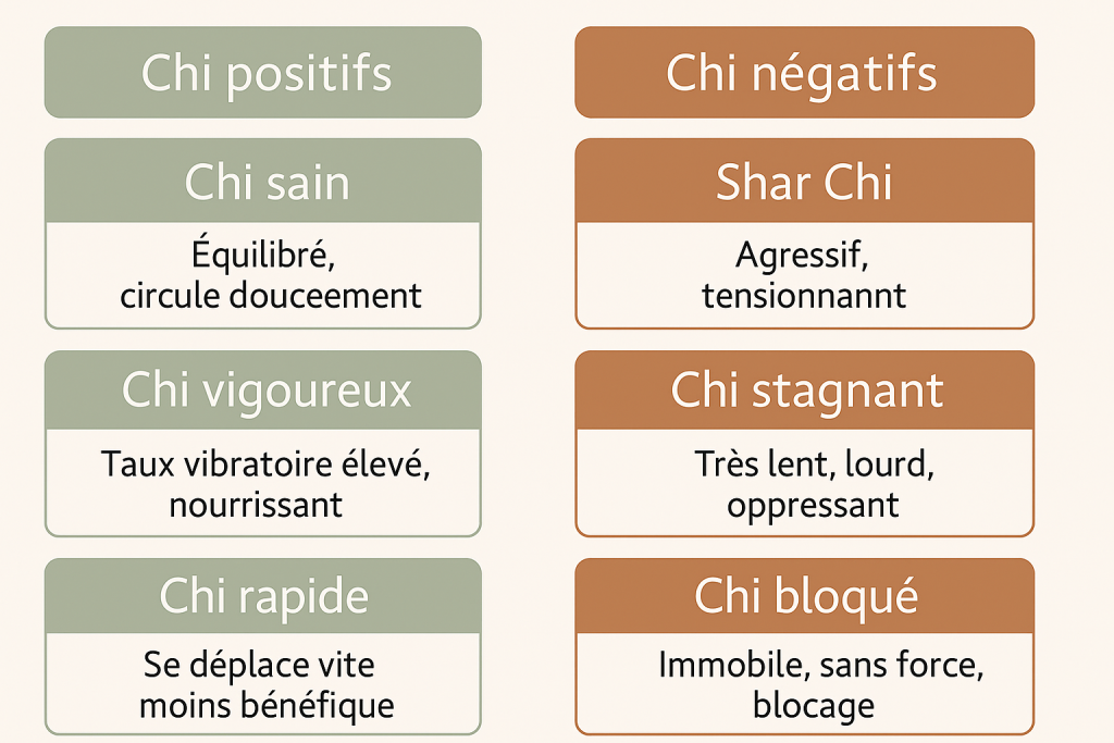 En Feng Shui, le Chi peut avoir différentes qualités. Certaines sont nourrissantes et bénéfiques, d’autres au contraire fatiguent ou déséquilibrent un lieu.
