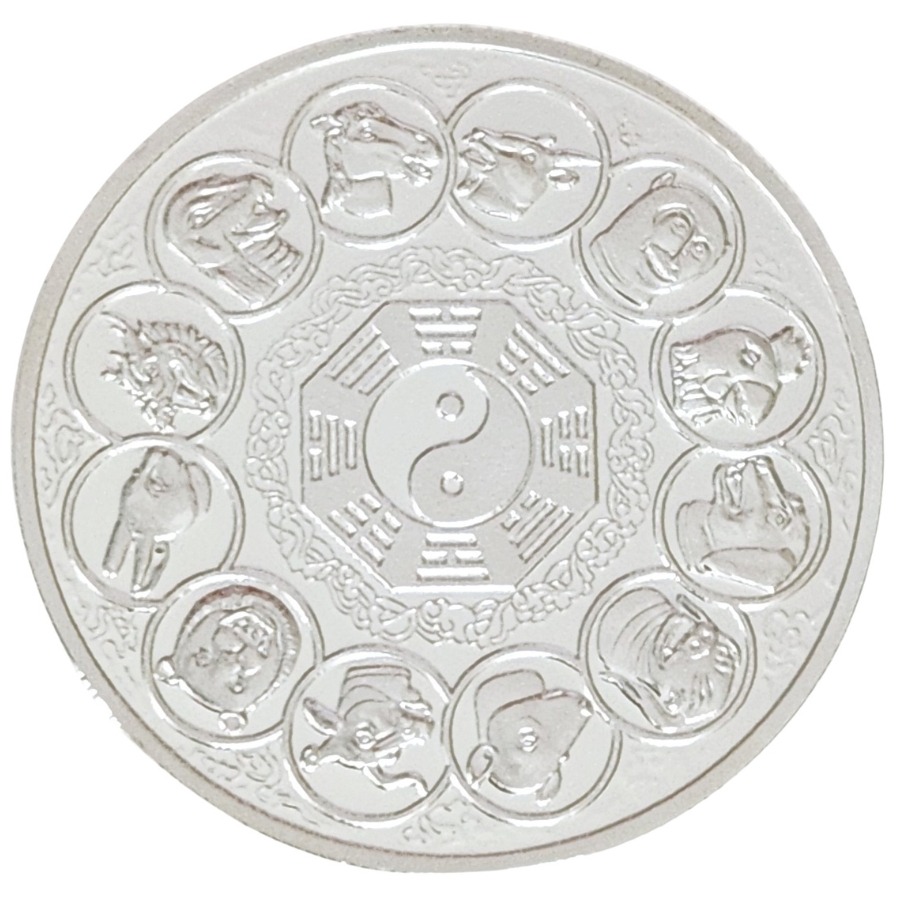 Au dos de l’amulette apparaissent les 12 signes du zodiaque chinois, organisés autour du symbole du Yin et du Yang.