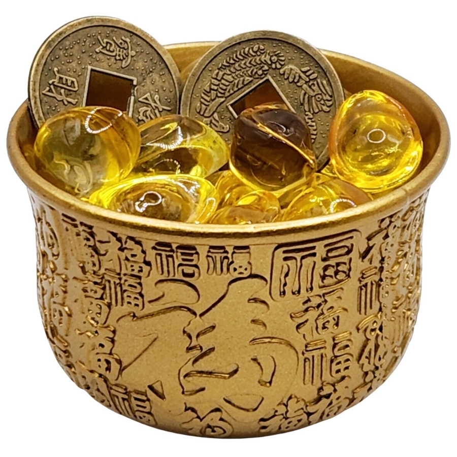 Le bol d’abondance ne se limite pas à sa forme symbolique. En effet, on le garnit traditionnellement de lingots d’or, de pièces chinoises ou de tout symbole de richesse.