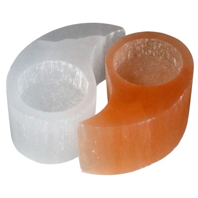 Ce bougeoir yin yang est composé de deux parties séparées, l’une en pierre de cristal de sel de l’himalaya et l’autre en pierre de sélénite: