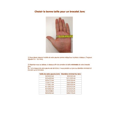 Pour connaitre votre taille de bracelet jonc merci de vous référer à la fiche technique présente à côté des photos.