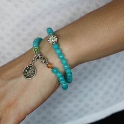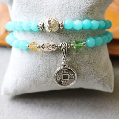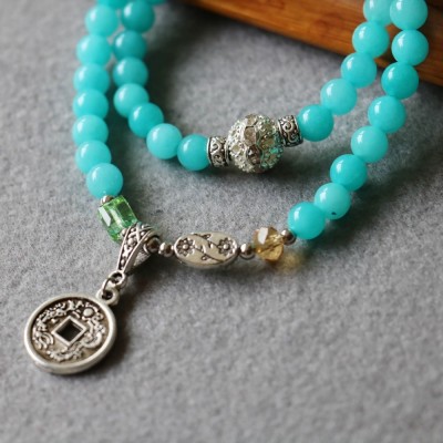 Les perles sont en amazonite, la pièce porte bonheur et les autres petits symboles sont en métal argenté.