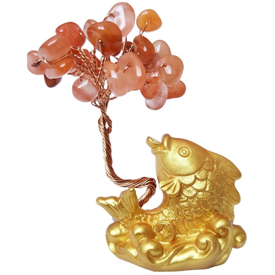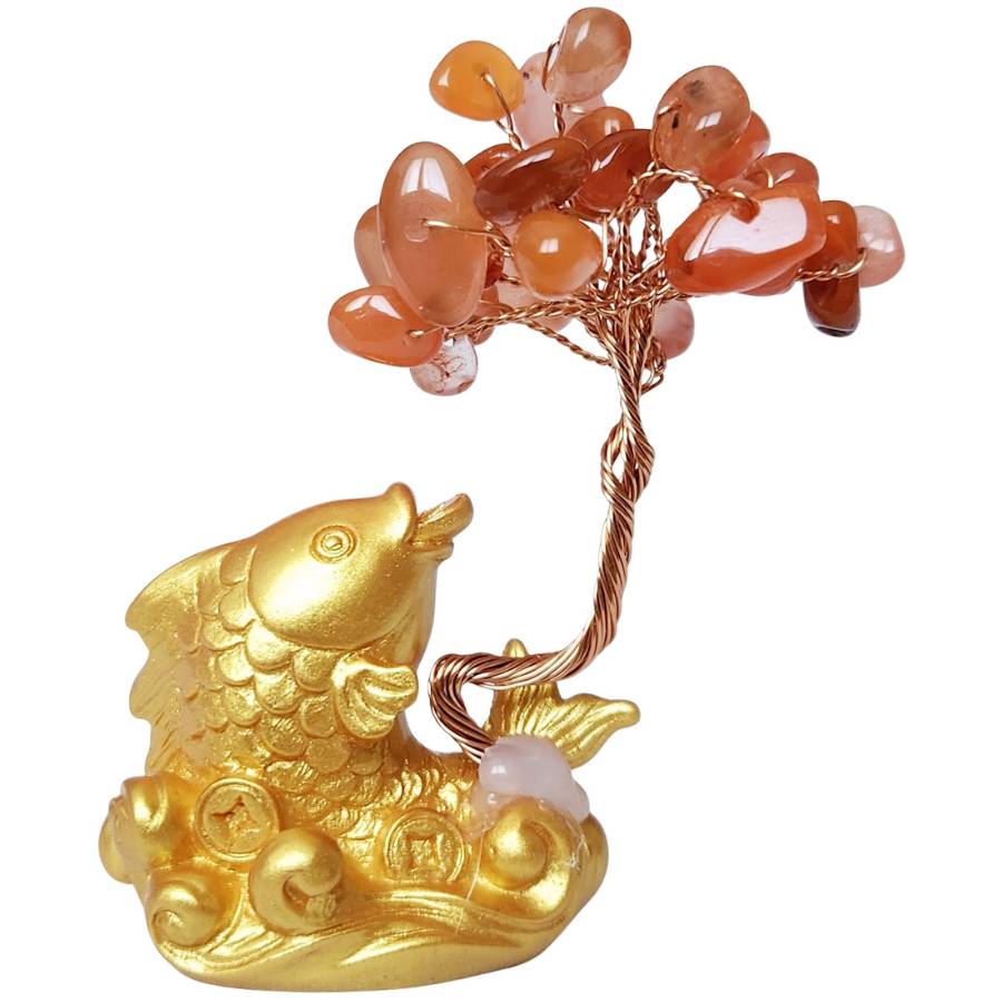 La carpe koï dorée associée à l’arbre en agate cornaline crée un ensemble lumineux et énergisant.