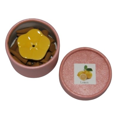 Le coffret comprend 1 soucoupe brûle encens en céramique et 30 encens cônes senteur citron.
