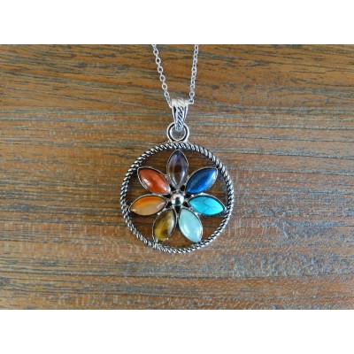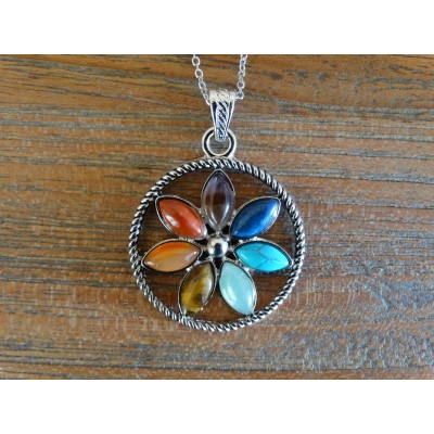 Le pendentif est constitué de 7 pierres naturelles, lapis-lazuli, turquoise, aventurine verte, oeil de tigre, carnélian, jaspe rouge et améthyste.