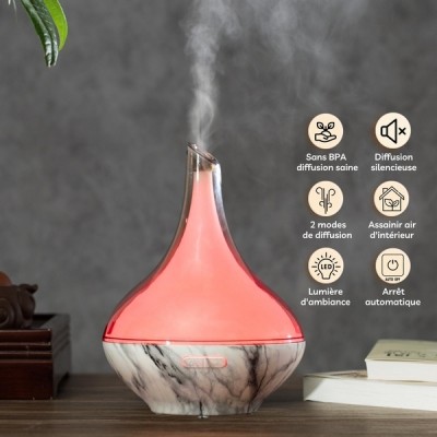 Le système de diffusion par ultrason génère un jet de brume et assure une diffusion à froid des huiles essentielles pour en conserver toutes les vertus. C’est donc une méthode de diffusion à froid respectueuse de vos huiles puisqu’elles ne sont pas détériorées par un apport trop conséquent de chaleur.