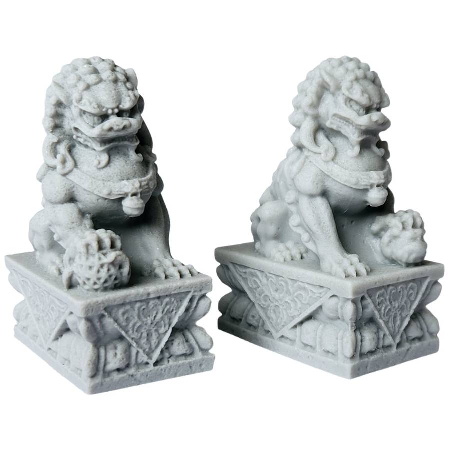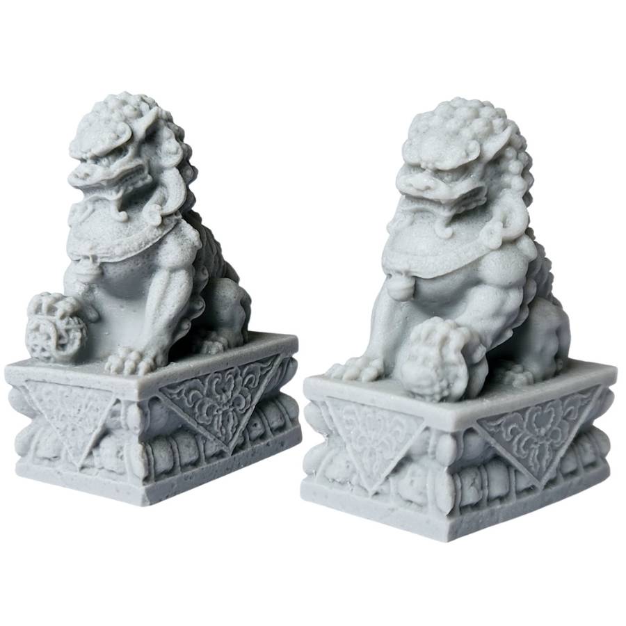Le mâle, positionné à gauche lorsque l’on fait face à la porte, incarne l’énergie yang. Sa patte posée sur un globe symbolise la protection contre les influences extérieures.