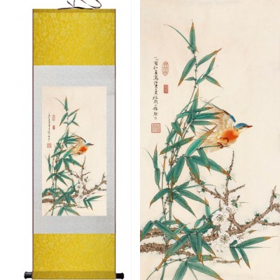 Le Grand Kakemono Bambous aux Oiseaux jaune Feng Shui, tableau zen, symbole de richesse, de santé et de longévité.