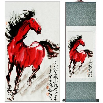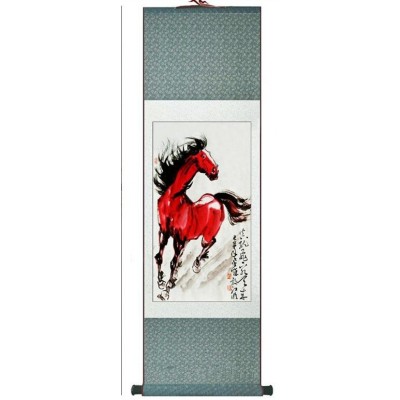 Le Grand Kakemono Cheval rouge au Galop Feng Shui, tableau zen, emblème de puissance, de persévérance et de courage.