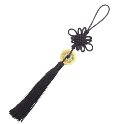 La suspension combine les énergies positives des pièces de monnaie chinoises, qui attirent la bonne fortune, celle du nœud mystique sans fin, qui symbolise la continuité et l’harmonie.