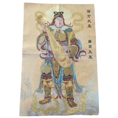 Le Grand Tangka Tapisserie Dhritarashtra Gardien Céleste Feng Shui, véritable tableau zen, symbole de protection, de connaissances et de savoir.