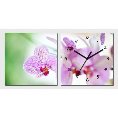 Ce beau tableau horloge diptyque est une impression sur toile représentant de belles fleurs d’orchidée.