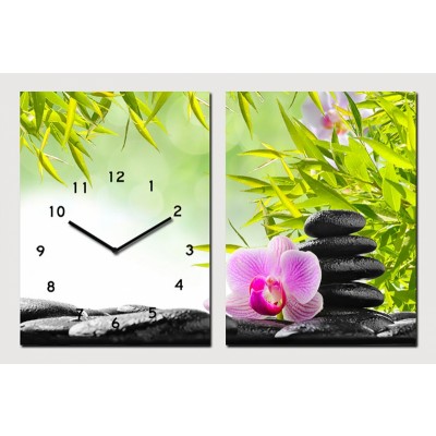 Ce beau tableau horloge diptyque est une impression sur toile représentant plusieurs symboles.