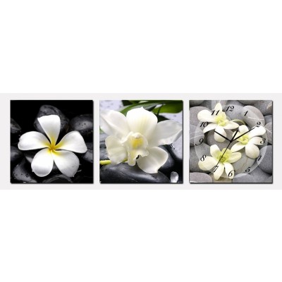 Ce beau tableau horloge triptyque est une impression sur toile représentant de belles fleurs de tiaré et d’orchidées