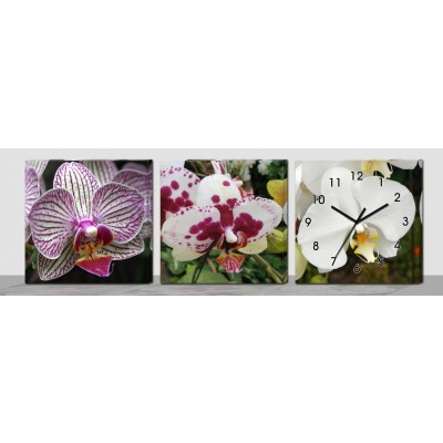 Ce tableau horloge triptyque est une impression sur toile représentant de belles fleurs d’orchidée.