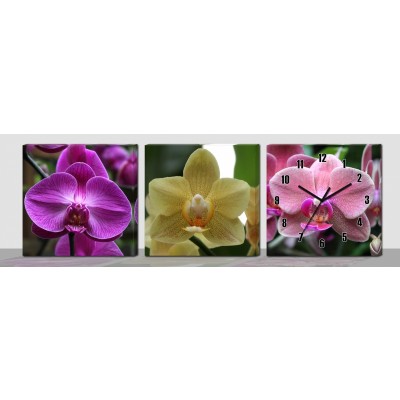 Ce tableau horloge triptyque est une impression sur toile représentant de trois belles fleurs d’orchidées.