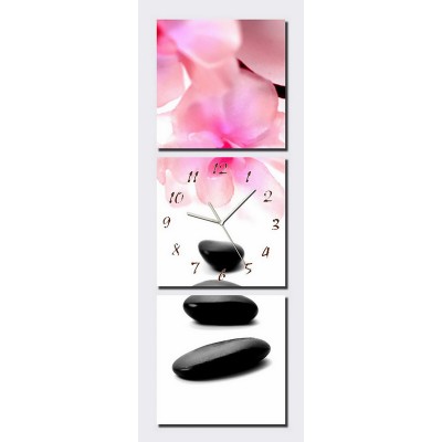 Ce tableau horloge tryptique est une impression sur toile représentant de belles fleurs d’orchidées et des galets.