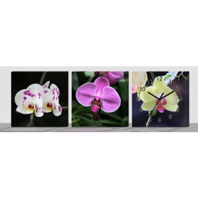 Ce tableau horloge triptyque est une impression sur toile représentant trois belles fleurs d’orchidée.