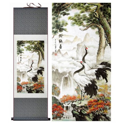Le Kakemono Oiseaux Grues dans la montagne Feng Shui, symbole de protection, de projection sereine dans l’avenir et dans ses projets.