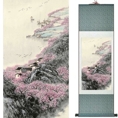 Le Kakemono Paysage Fleurs de Cerisier rose Feng Shui, tableau zen, symbole de croissance, de renaissance et de prospérité.