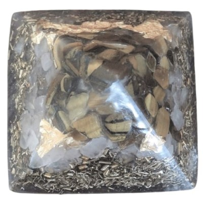 La base de l’orgonite pyramide mesure 6cm de largeur et sa hauteur est de 5cm.