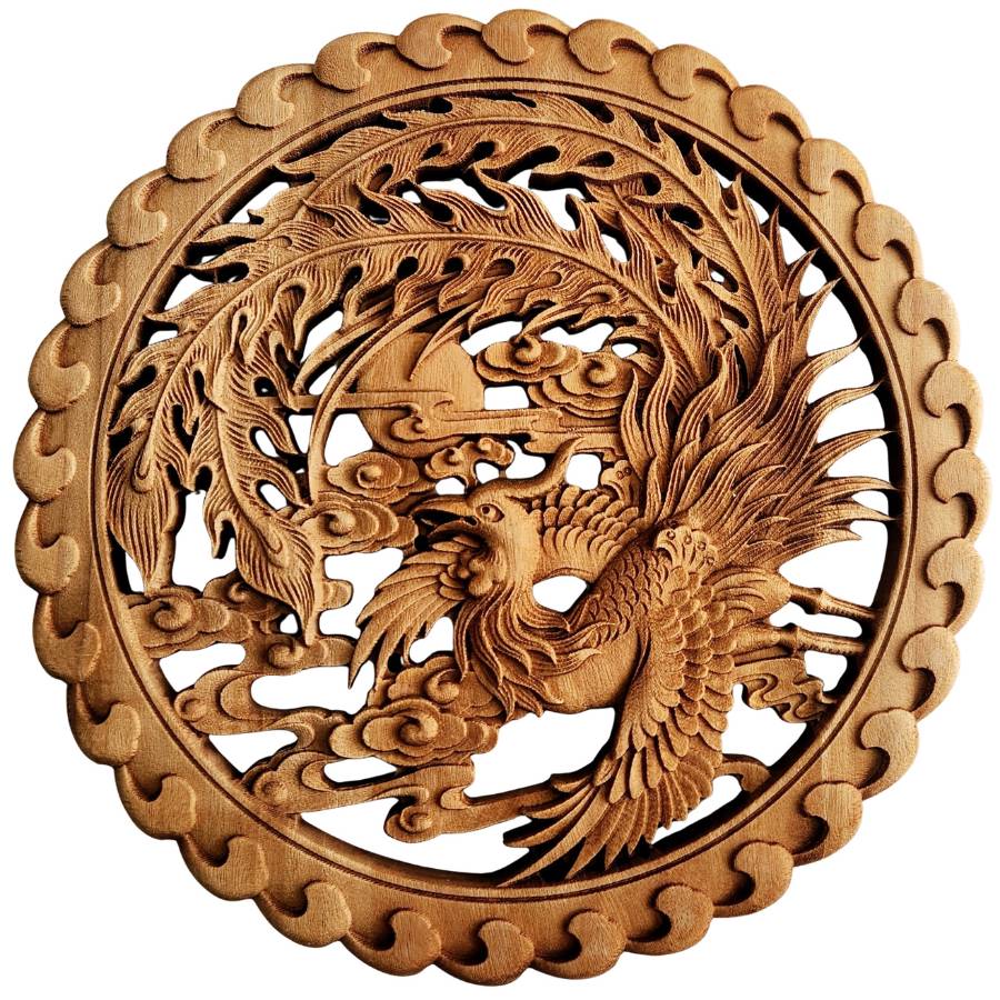 Le Panneau Décoratif Sculpté Phénix de Feu représente l’un des symboles les plus puissants de transformation en Feng Shui.