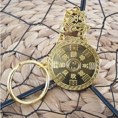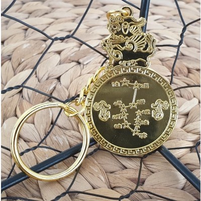 Ce talisman porte clés est représenté sous la forme d’une pièce ou apparait sur une face le bagua, sur l’autre les 8 étoiles volantes. Elle est surmontée d’un Pi Yao.