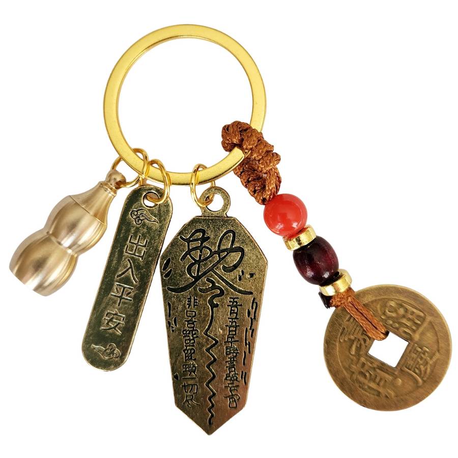Ce talisman associe une amulette de protection, un talisman taoïste, une pièce chinoise et un Wu Lou, formant ainsi une combinaison complète et cohérente.