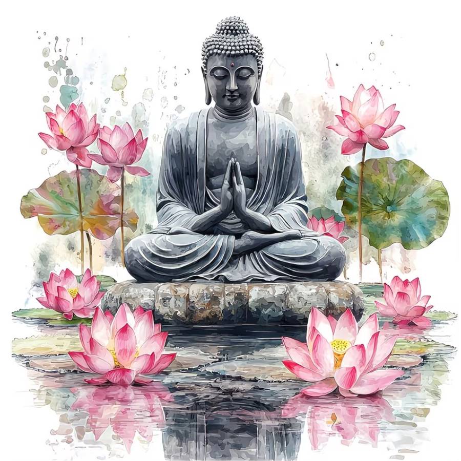 Autour du Bouddha, les fleurs de lotus viennent renforcer la symbolique.