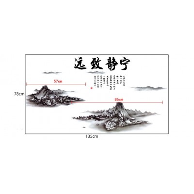 Le sticker calligraphie et paysage de montagne mesure 78cm de hauteur et 135cm de largeur moné.