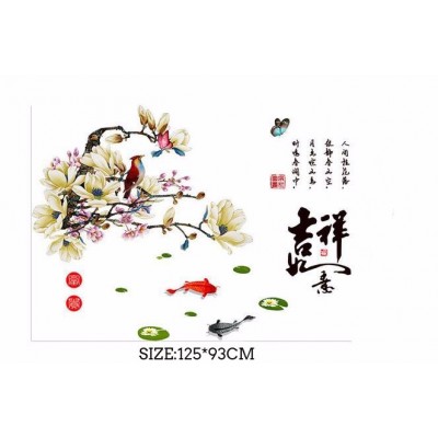 Ce beau sticker fleurs de magnolia, calligraphie et poissons carpes représente l’élément Bois, on le colle donc dans le secteur Prospérité au Sud-est, dans le secteur Santé à l’Est ou dans tout autre secteur nécessitant de l’élément Bois (voir étoiles volantes).