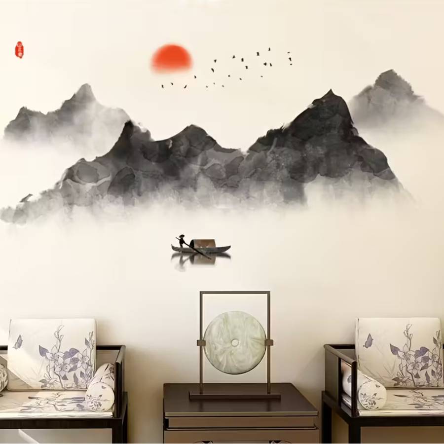 Ce sticker montagne Feng Shui évoque un paysage enveloppé de brume, presque silencieux.