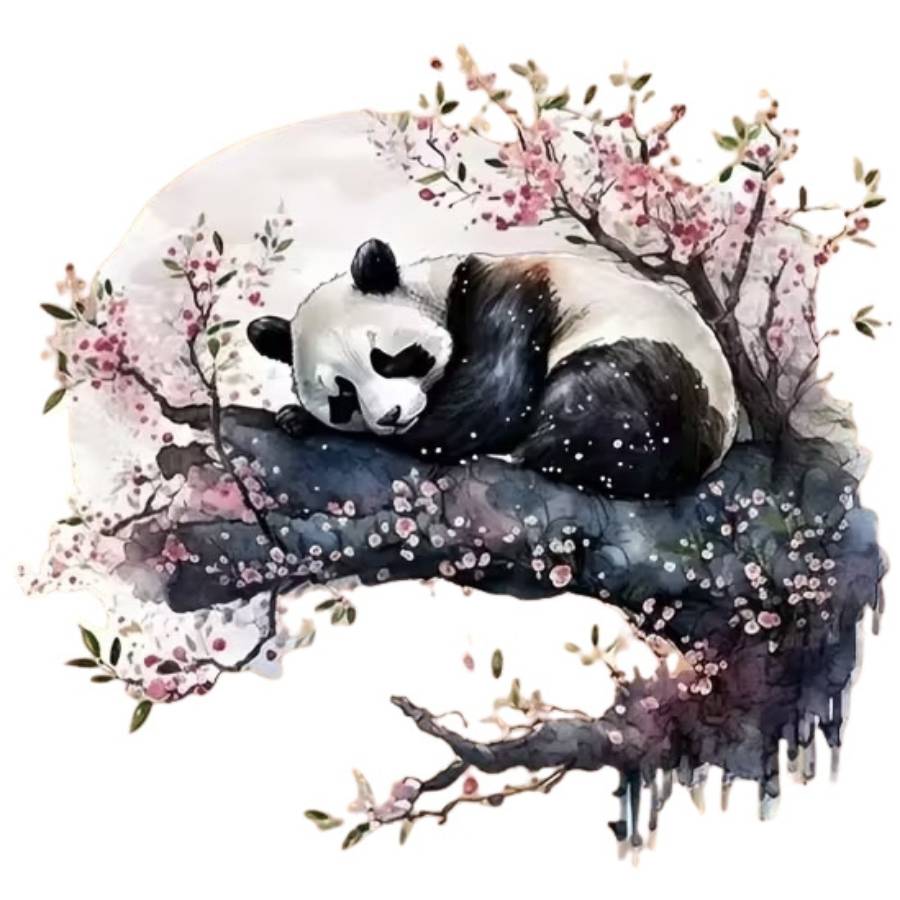 Autour du panda, les fleurs de cerisier viennent apporter une touche légère et poétique.