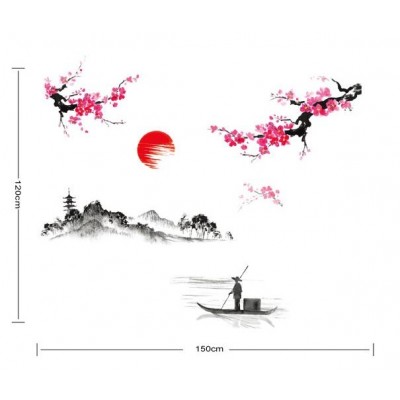 Le sticker paysage d’Asie et fleurs de cerisier monté mesure 120cm de hauteur et 150cm de largeur monté.