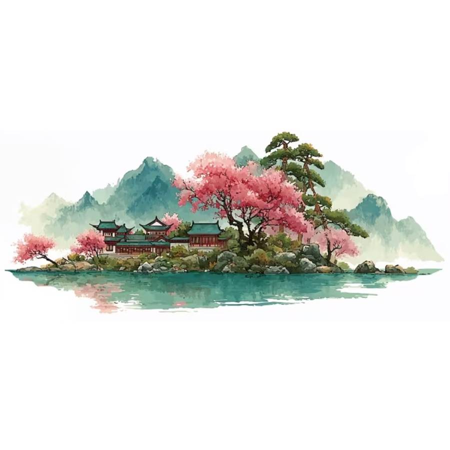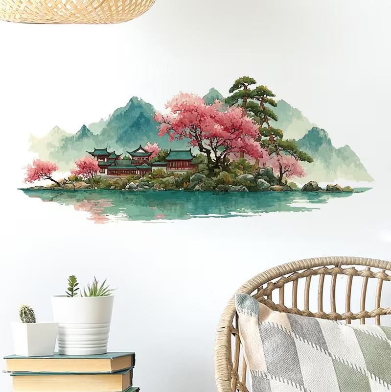Avec ses couleurs douces, ses touches de vert et de rose, ce sticker paysage Feng Shui apporte immédiatement une sensation de calme.