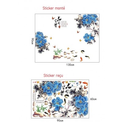 Le sticker pivoines bleues monté mesure 90cm de hauteur et 130cm de largeur.