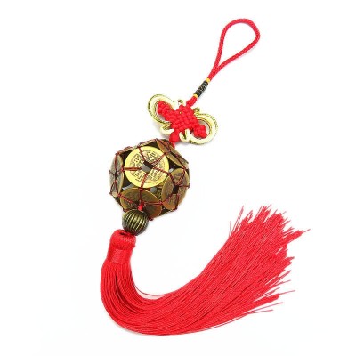La Suspension 12 Pièces de Monnaie Boule Feng Shui avec noeud sans fin, symbole populaire de richesse, de prospérité et d’abondance dans tous les domaines de votre vie.