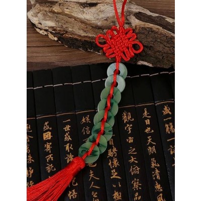 La suspension Feng Shui est ici représentée sous la forme de 8 pièces de monnaie chinoise en Jade vert.