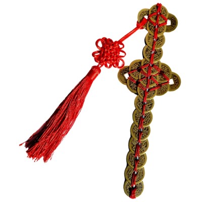 L’épée est donc composée de pièces de monnaie chinoises, attachées avec des fils rouges, couleur d’énergie et de protection, et formant une épée. On dit que les fils rouges renforcent l’énergie des pièces.